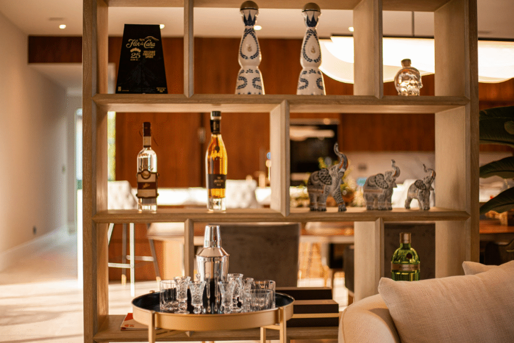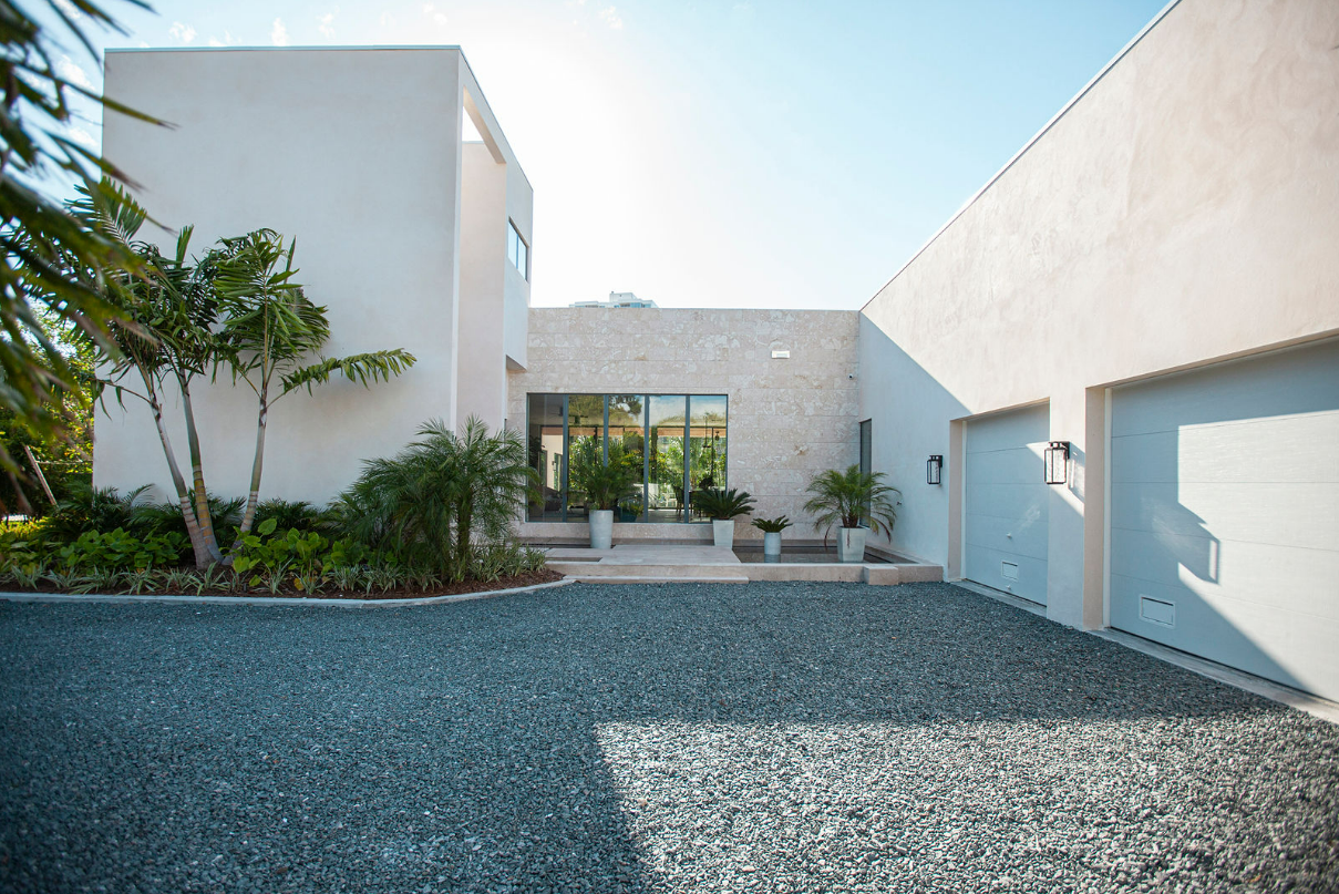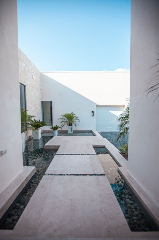 From the street, Casa Carrera presents a sculpted façade of stone and white plaster, softened by tropical landscaping. A landscaped forecourt introduces the property with layered palms and garden beds, leading to a raised entry sequence. The front door is framed by natural stone and flanked by tall glazing, offering glimpses into the interiors. Floating walkways over reflecting pools emphasize arrival, blending water, light, and architecture into a serene entry moment.