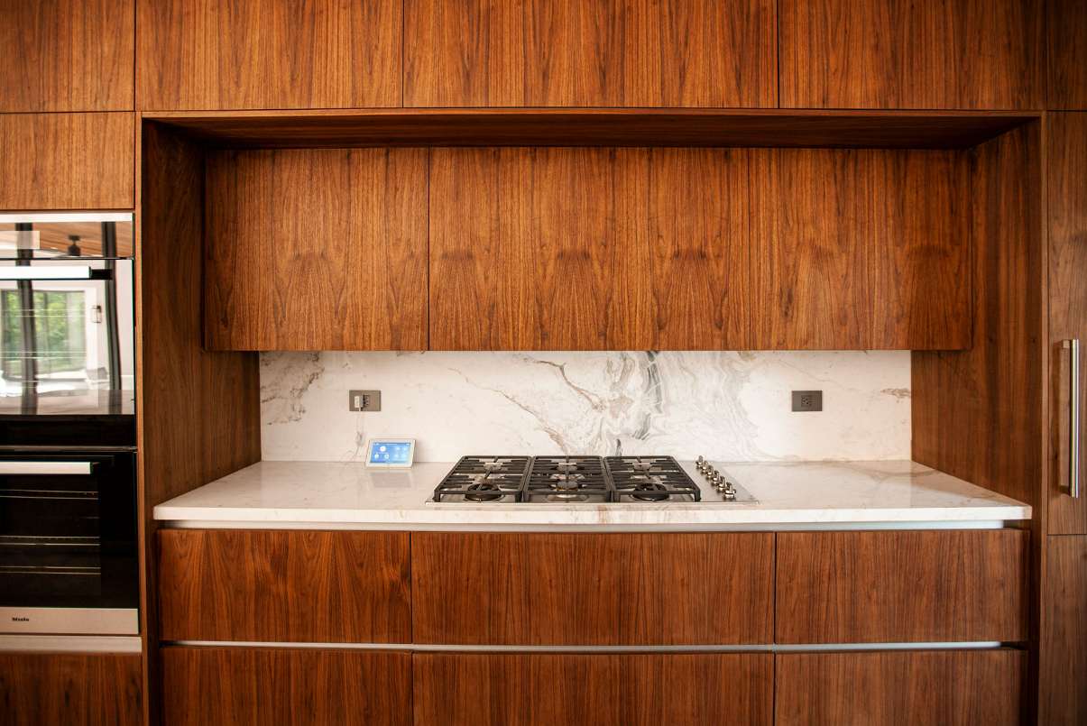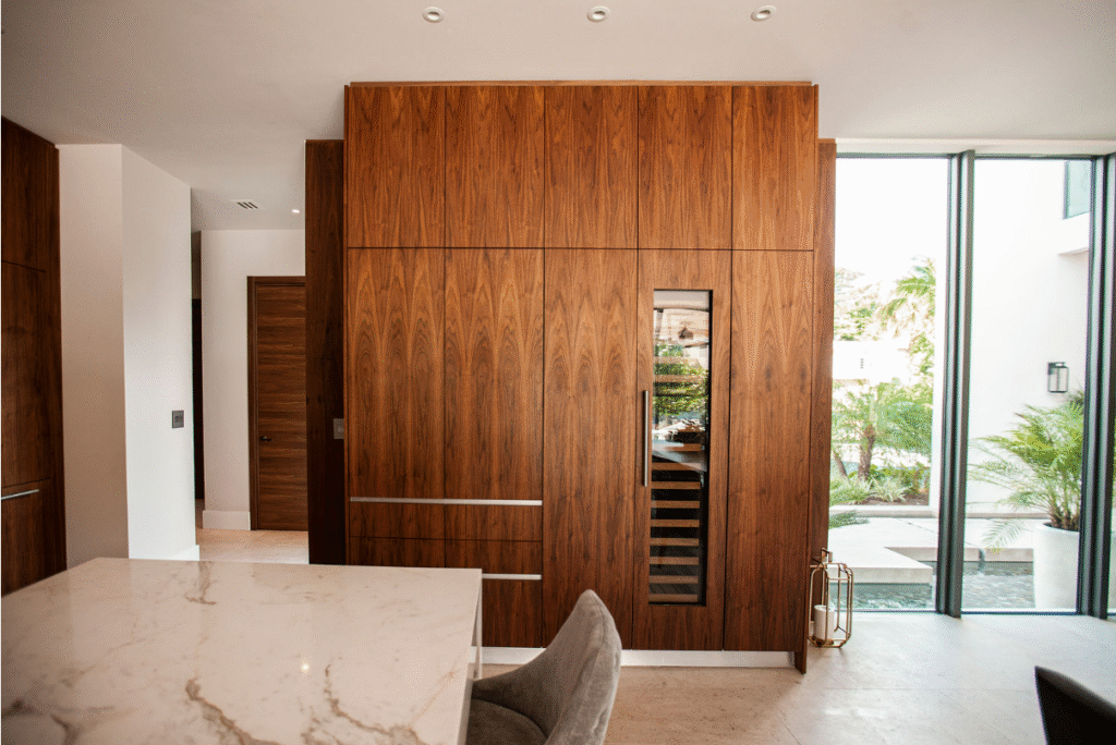 The kitchen is designed as both a social hub and a chef’s workspace. Full-height walnut cabinetry conceals appliances and maintains visual calm, while a long marble island offers preparation space and casual seating. Refined details—integrated lighting, natural veining in the stone, and warm metal fixtures—add sophistication to the space. Adjacent, the dining area is defined by a long wood table with upholstered chairs, positioned between continuous glass walls that open directly to the terrace. A custom shelving wall frames the background, showcasing curated objects and greenery while maintaining visual continuity with the architecture.