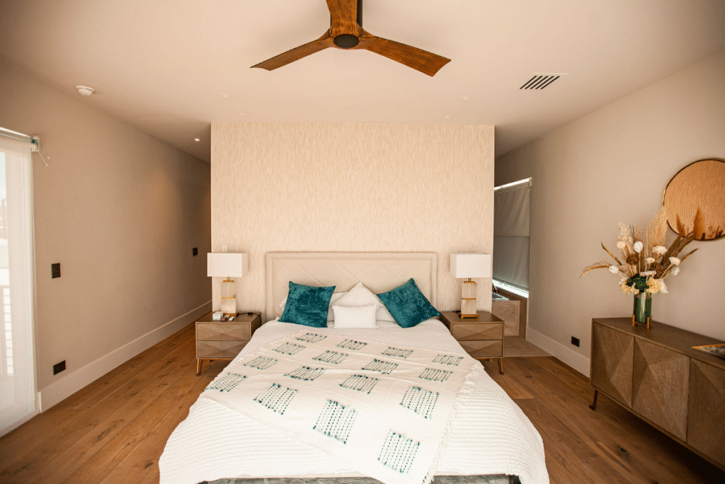 Every detail of Casa Carrera is shaped for both elegance and resilience. High-performance glazing, deep overhangs, and natural ventilation ensure comfort in the tropical climate. Durable materials—stone, stucco, and marine-grade metals—guarantee longevity, while concealed lighting, flush thresholds, and refined millwork maintain visual calm. At dusk, the residence glows warmly against the water, embodying a refined vision of modern coastal living.