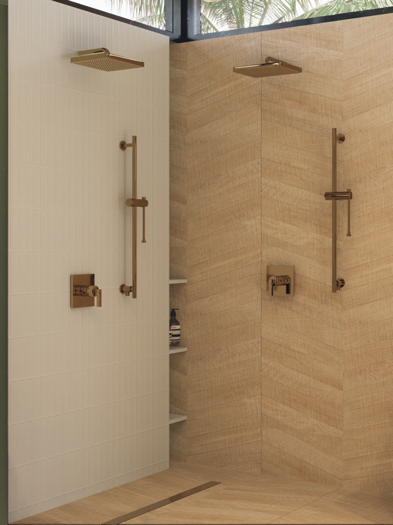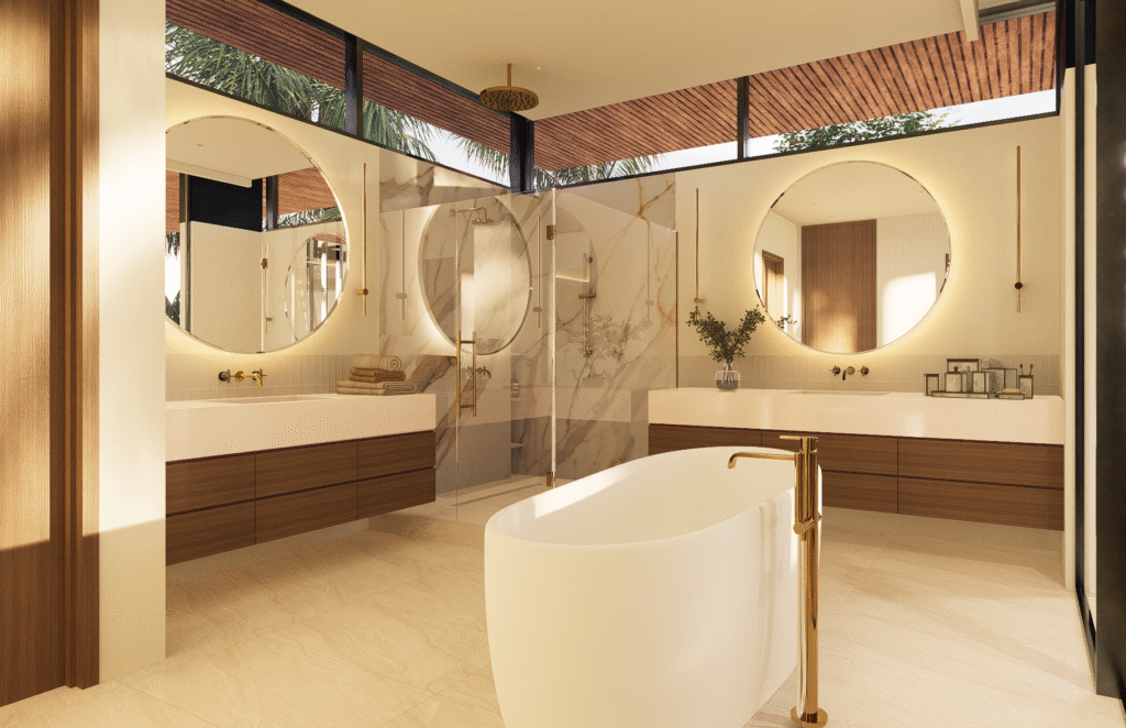 Spa-like bathrooms pair natural finishes with clean detailing. Floating vanities—timber drawers under crisp, integrated tops—face halo-lit circular mirrors. The primary bath centers on a sculptural freestanding tub with a floor-mounted brass filler, set between twin vanities. A generous glass enclosure houses dual rain showers with hand sprays, a built-in bench, and linear drain; large-format stone with soft veining wraps walls and floors for a seamless, monolithic feel. Warm metal fittings, open niches, and clerestory glazing complete a space that is bright by day and quietly atmospheric by night.