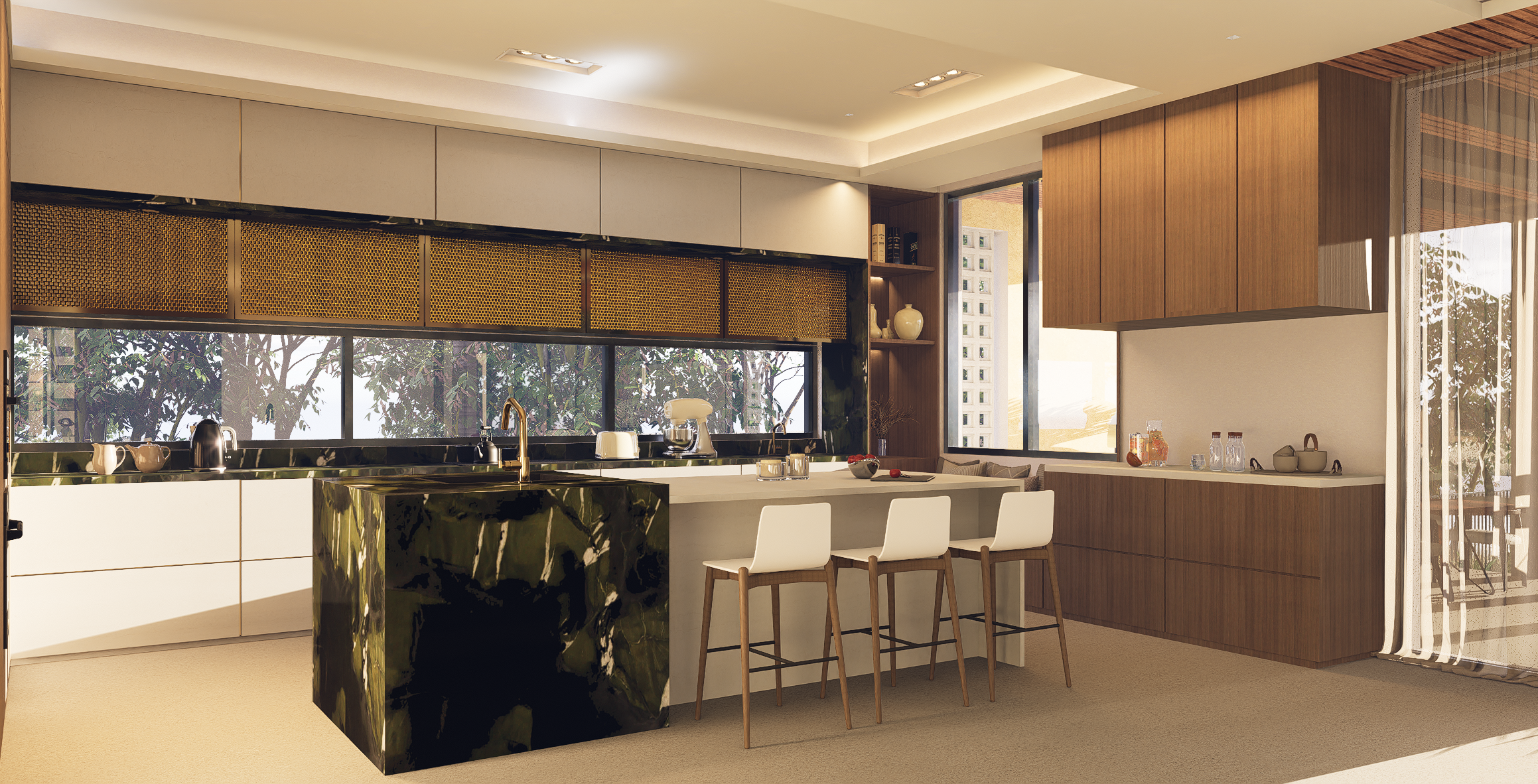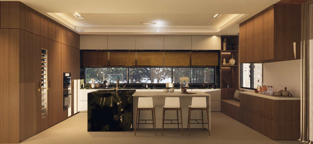 The kitchen is a study in contrast and craft. A monolithic island in deeply veined dark stone anchors the workspace; a second, lighter island welcomes seating for casual meals. Full-height walnut cabinetry conceals premium appliances and a temperature-controlled wine column, keeping the room visually quiet. A long, low window runs the length of the counter, bringing the garden to eye level and ventilating the space, with woven screens that temper afternoon sun. A built-in banquette tucks along the side wall—perfect for coffee, homework, or late-night conversation—while sliders connect directly to the terrace for effortless indoor–outdoor entertaining.