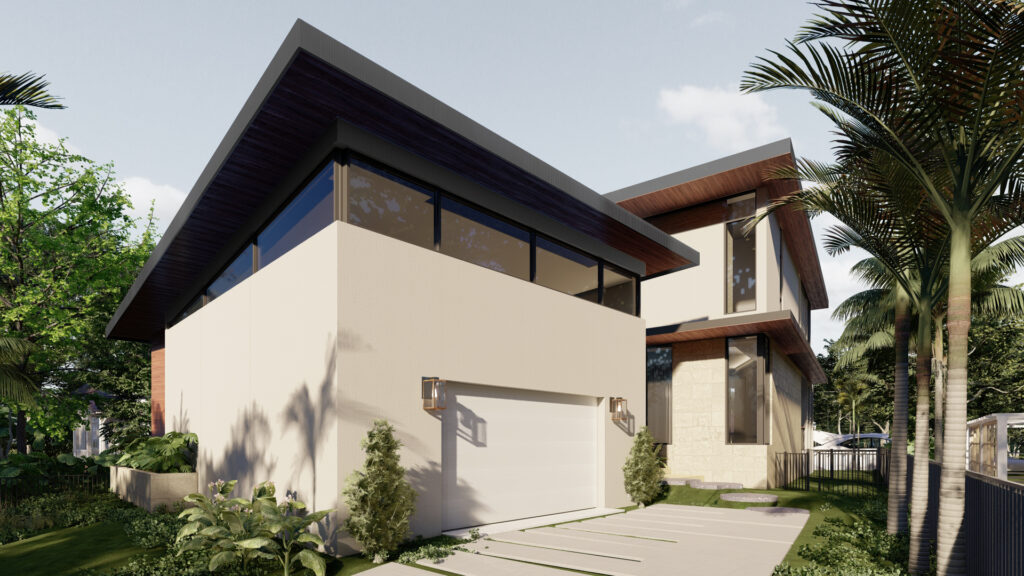 A calm, tropical modern home shaped for easy everyday living, Casa Mariposa choreographs light, shade, and breeze across two levels. Low, protective eaves, broad panes of glass, and a warm palette of natural stone, timber soffits, and finely detailed millwork create a relaxed coastal character from arrival to retreat.
