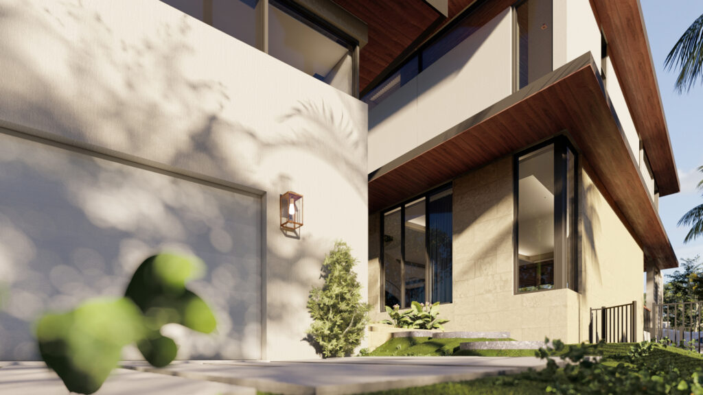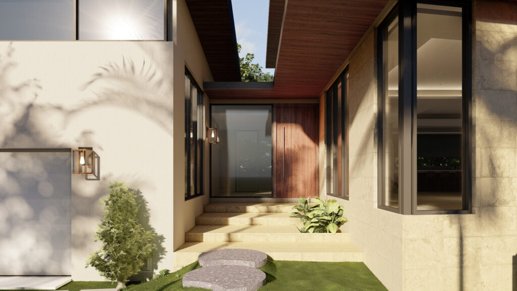 From the street the home presents a quiet, tailored elevation. A gently sloped drive arrives beneath the shelter of the roof; linear sconces in warm metal finish mark the entry. The front door—crafted in rich wood—sits within a pocketed vestibule framed by limestone cladding and tall corner windows, so the approach feels intimate and shaded. A slim ribbon of clerestory glazing crowns the garage volume, and low planter beds soften the base, guiding you to a set of floating stone steps at the threshold.