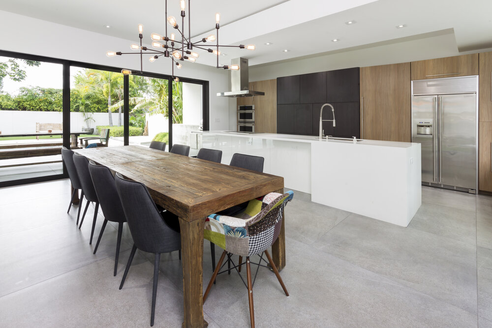 The kitchen is conceived as both a workspace and a social hub, defined by crisp white cabinetry, natural wood finishes, and a long island that doubles as preparation and gathering space. Adjacent, the dining area features a rustic wooden table paired with upholstered chairs, oriented toward the garden through expansive glazing. Overhead, a contemporary chandelier provides contrast and sculptural presence.