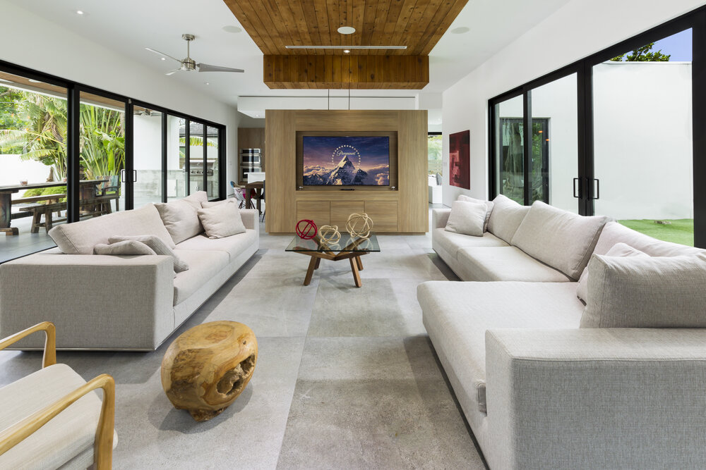 The main living room is defined by its openness and natural light. Full-height sliding glass doors blur the boundary between inside and outside, creating constant dialogue with the gardens. Neutral furnishings in soft fabrics are complemented by natural wood accents, while sculptural coffee tables and built-in shelving add character. A wood-clad ceiling feature lends warmth to the otherwise minimalist interiors.