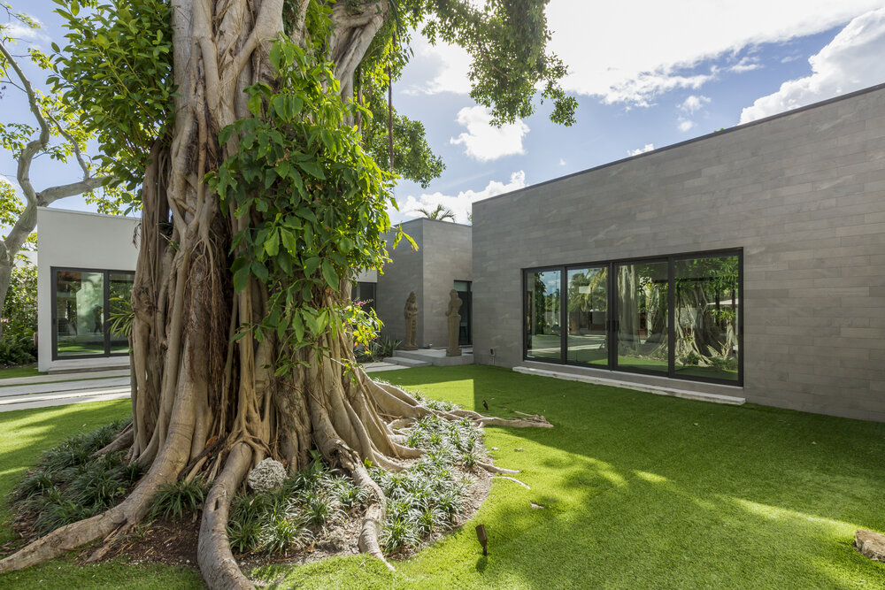 The villa is organized as a series of interlocking volumes articulated by wood, stone, and smooth stucco. Large expanses of glazing frame views of gardens and courtyards, while flat roofs and deep overhangs provide shade and extend the horizontality of the design. The plan emphasizes indoor-outdoor fluidity, ensuring that each space flows naturally into the next while remaining connected to nature.