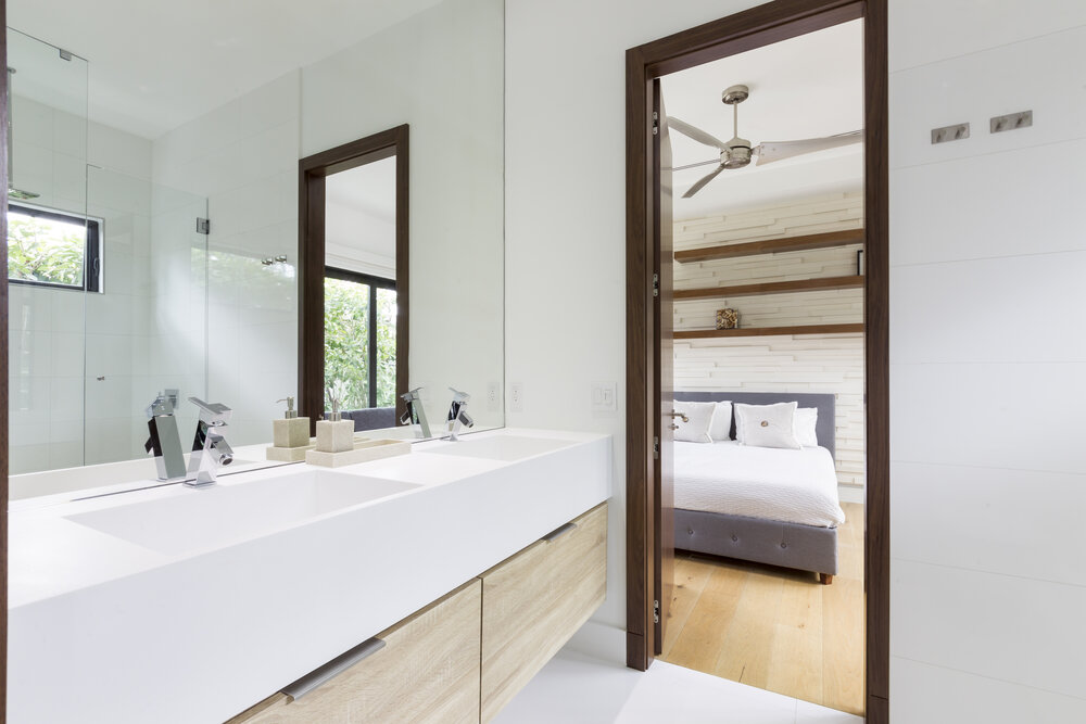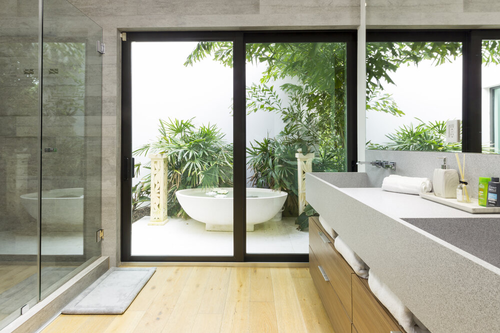 Bathrooms are designed as spa-like retreats. Floating vanities in stone and wood, large mirrors, and frameless glass showers enhance the sense of openness. In the master bath, a freestanding tub is set against a backdrop of greenery in a private courtyard, blurring the line between indoor luxury and outdoor tranquility.