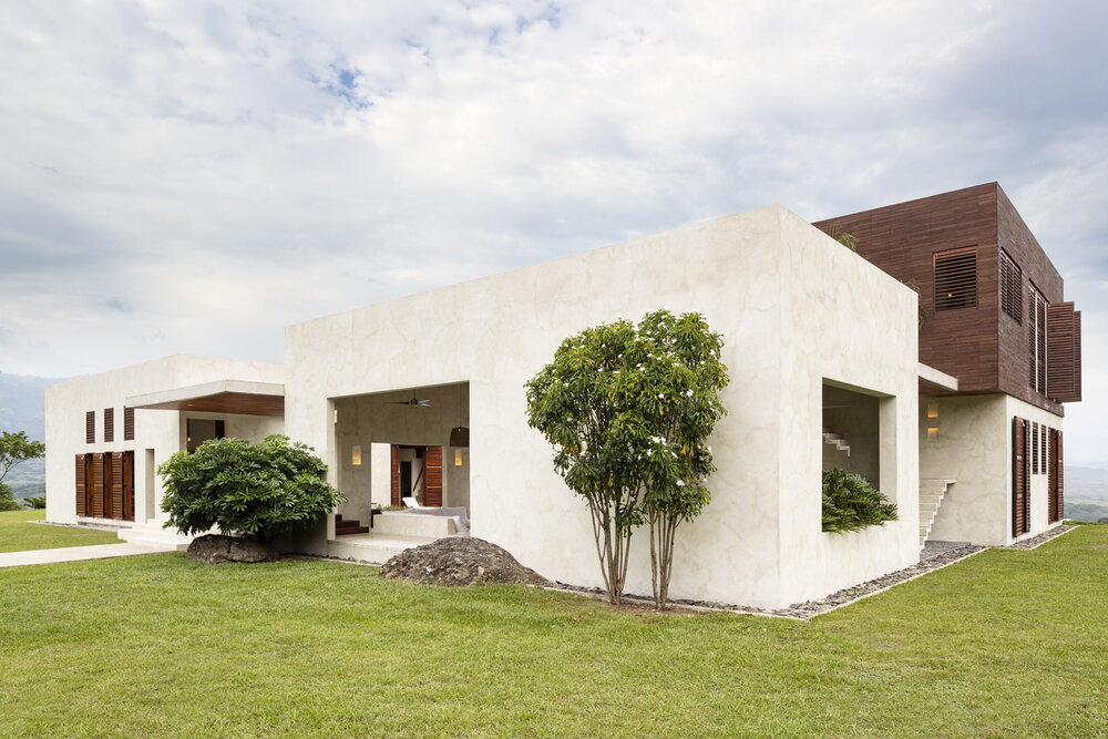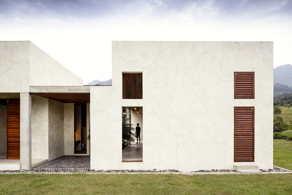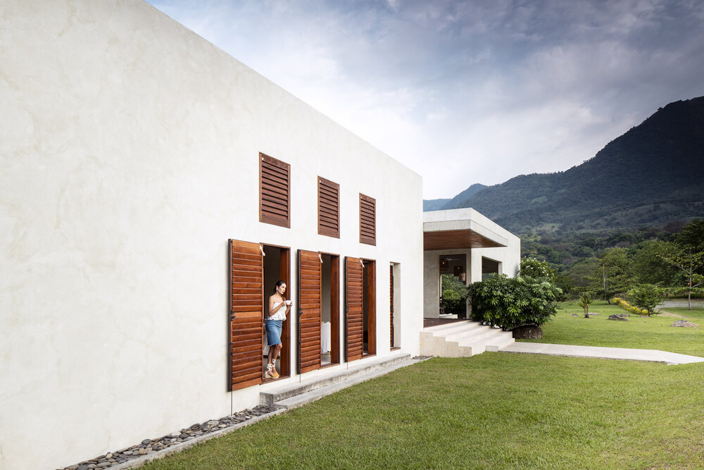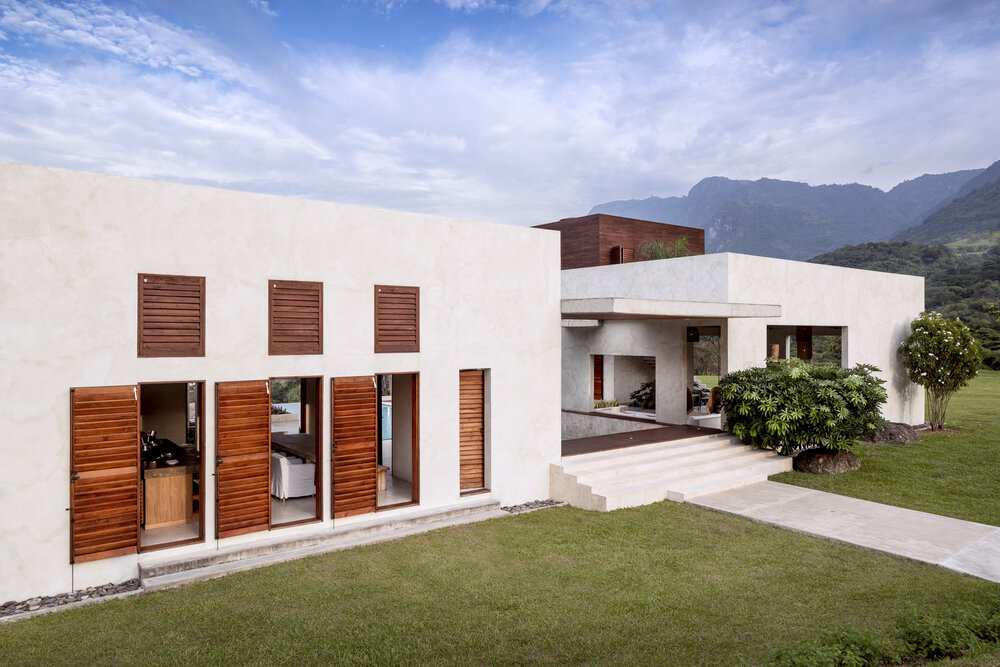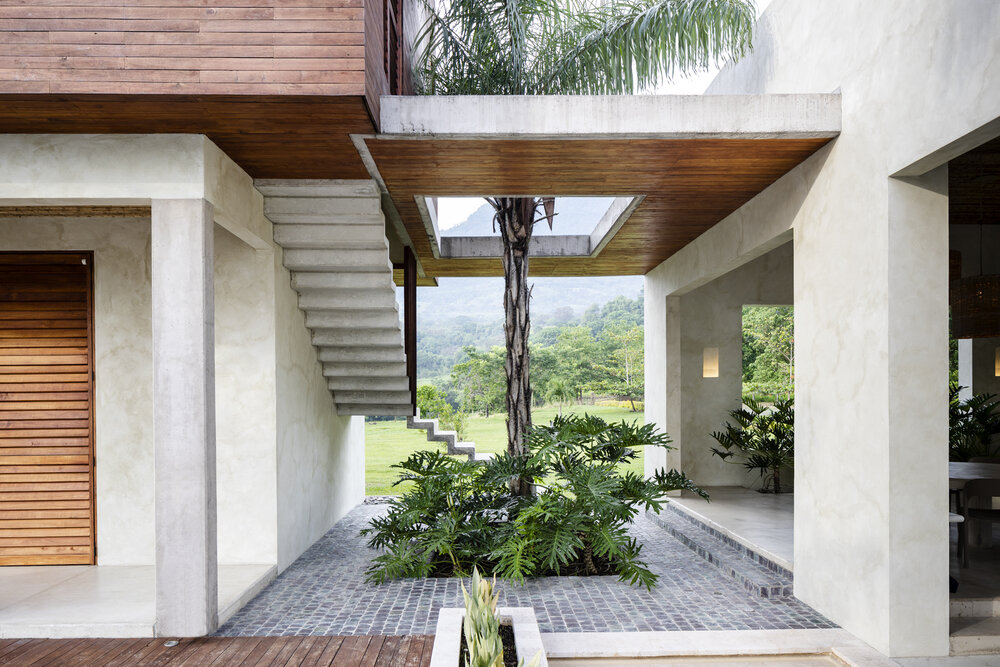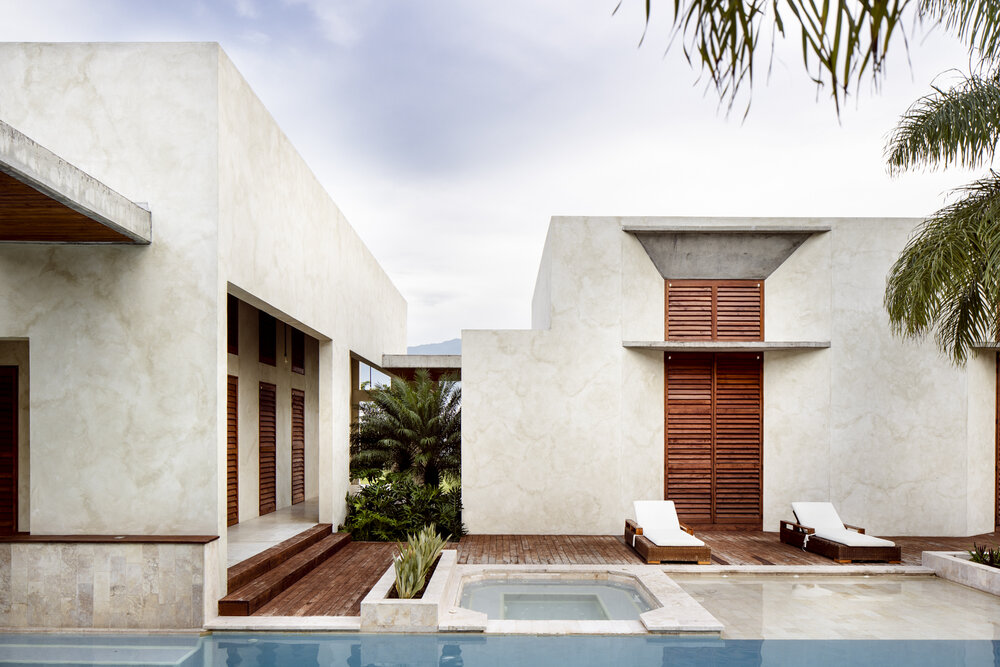 The design is rooted in strong geometric forms and honest materials. Stucco walls, raw concrete elements, and extensive use of tropical wood define the architectural language, combining permanence with warmth. The villa’s plan unfolds in separate wings, creating a balance between private and social spaces. Expansive glazing and wooden shutters provide flexibility—framing views, maximizing ventilation, and shading interiors when needed.