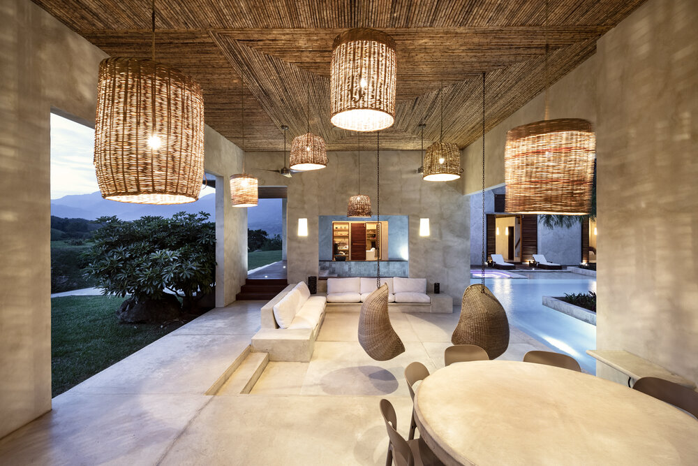 At the heart of the villa, the living and dining areas are conceived as open-air pavilions. Generous ceiling heights, bamboo-lined ceilings, and woven pendant lamps create an atmosphere of relaxed sophistication. Built-in seating lines the perimeters, while suspended chairs add playful yet refined touches. The social spaces are deliberately porous, opening directly to the pool and surrounding gardens, ensuring constant interaction between architecture and landscape.