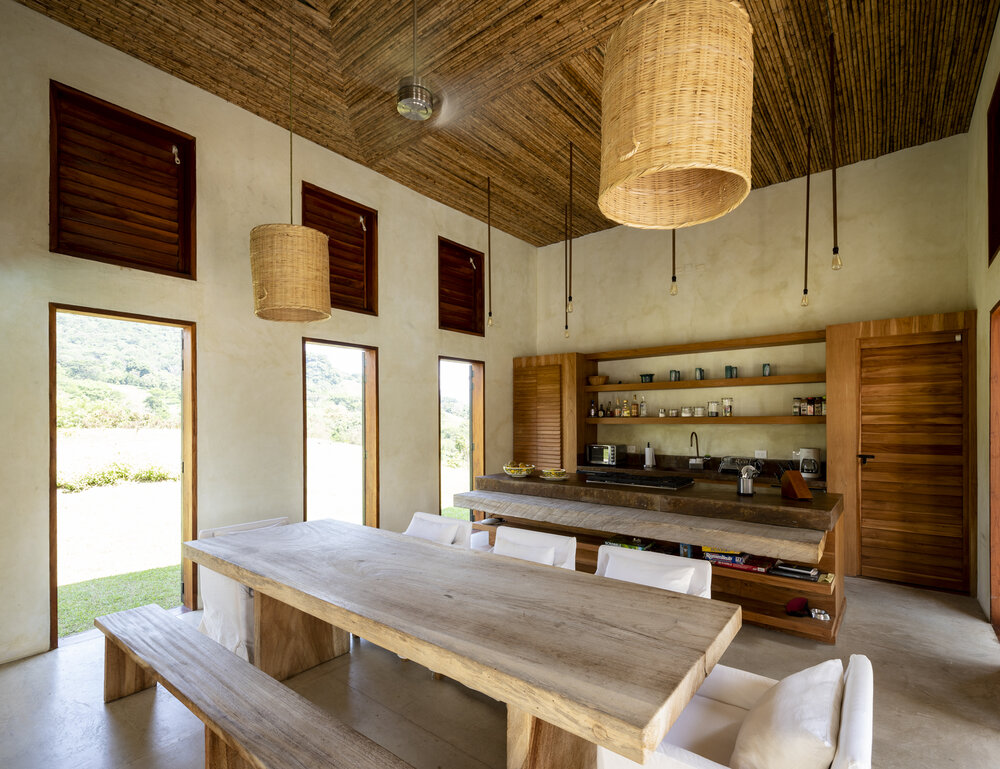 The kitchen is crafted in raw materials—stone counters, natural wood cabinetry, and exposed shelving—that reflect the villa’s organic ethos. Adjacent, a large dining hall with double-height ceilings is finished with simple, robust wooden tables and benches, designed for both intimate family meals and larger gatherings. Light filters in through tall openings with wooden shutters, animating the interior throughout the day.