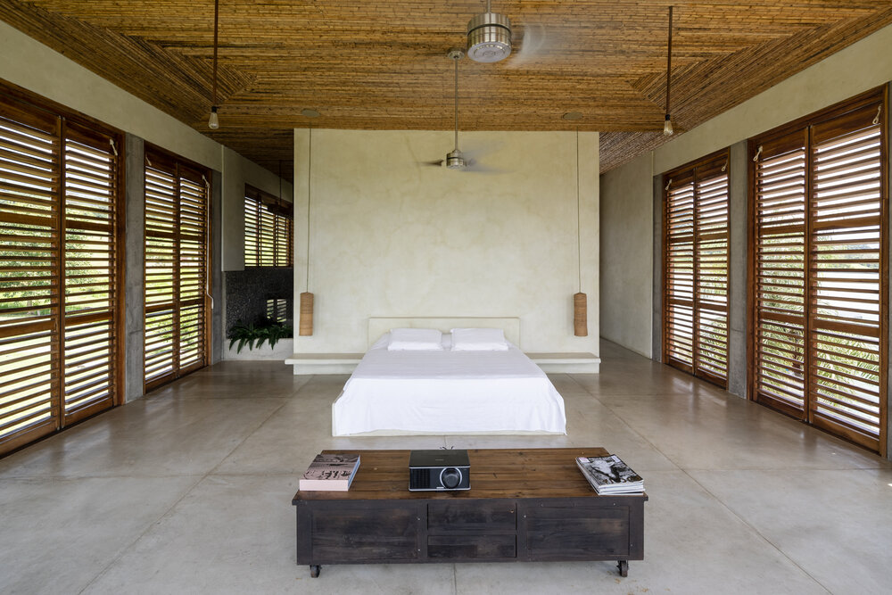 The private suites are designed as serene retreats, characterized by concrete floors, minimalist furnishings, and an abundance of natural light. Each bedroom opens directly to the outdoors, ensuring a seamless connection with the surrounding landscape. The primary suite is distinguished by its generous proportions and panoramic glazing framed by wooden louvers, offering privacy without sacrificing views or ventilation.