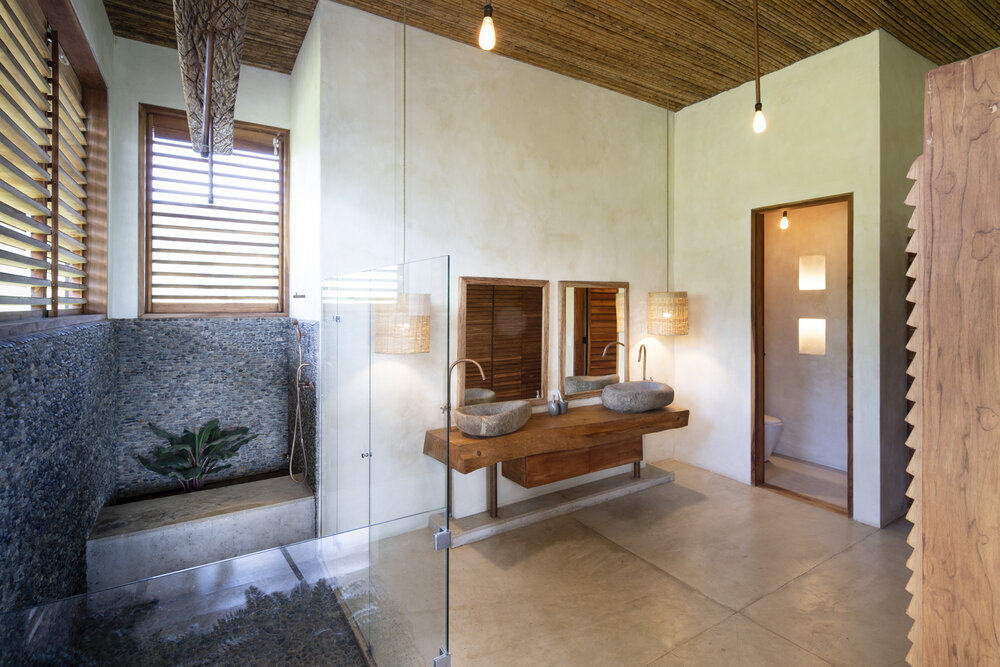 Bathrooms are designed with simplicity and authenticity, emphasizing raw finishes and natural textures. Stone counters, open showers, and timber detailing combine to create spa-like environments that feel both grounded and luxurious. The layouts privilege natural ventilation and light, reinforcing the villa’s dialogue with its tropical setting.